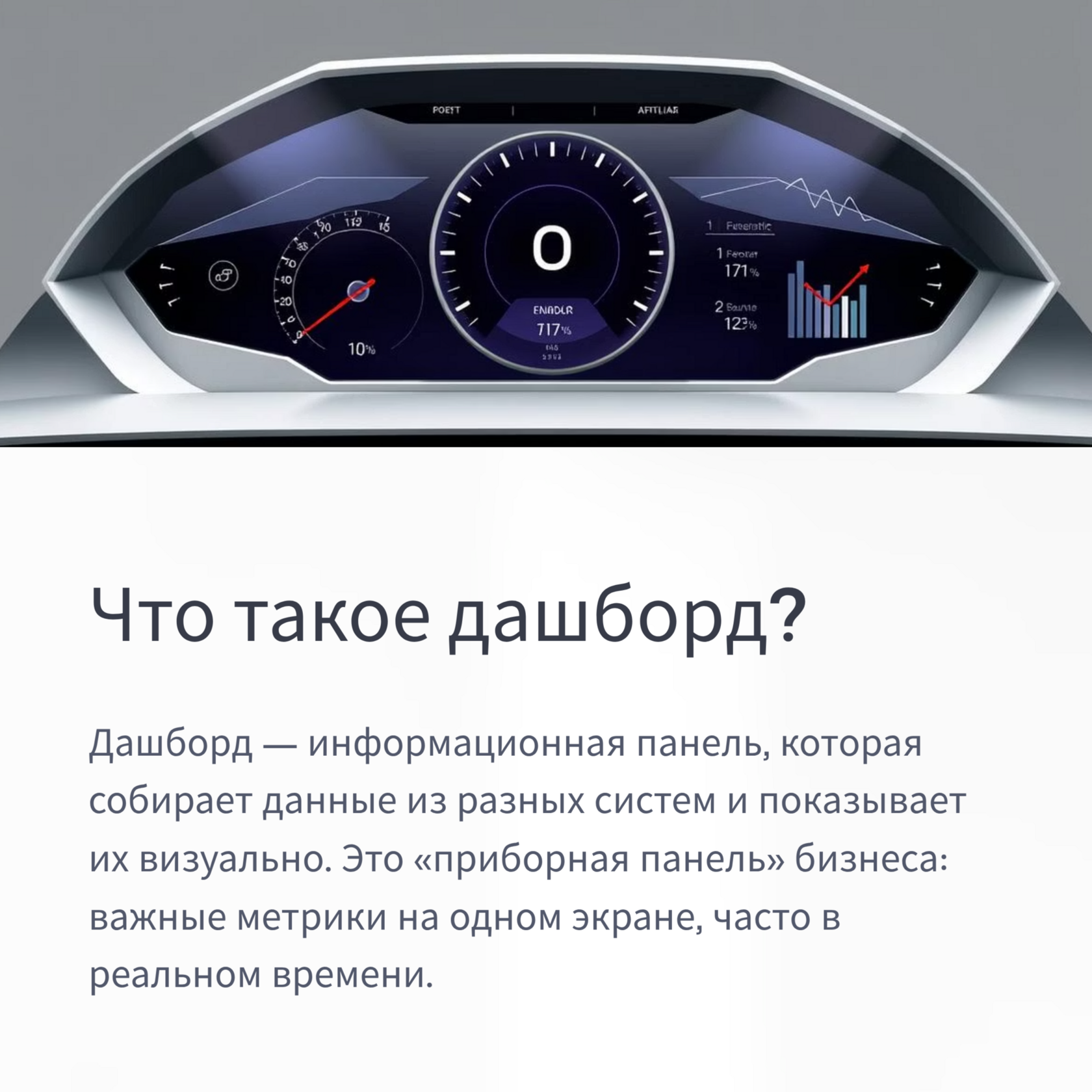 Дашборд это информационная панель, которая получает данные из различных систем и отображает их в понятном визуальном виде. Если говорить простыми словами — это ваша «приборная панель» для управления бизнесом, как в автомобиле, где вы видите скорость, уровень топлива и другие важные показатели.