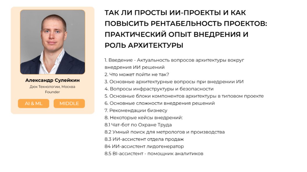 Александр поделится опытом нашей компании и представит доклад на тему: «Так ли просты ИИ-проекты и как повысить рентабельность проектов: практический опыт внедрения и роль архитектуры». Познакомиться с докладом можно по ссылке: https://orenburg2025.mergeconf.ru/speakers/development/aiml/suleikin